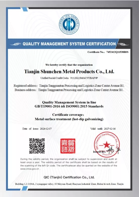 ผู้บริหารระดับสูงของ Shunchen มีประสบการณ์และเทคโนโลยีมากกว่า 20 ปีในการผลิตชุบสังกะสีแบบจุ่มร้อน