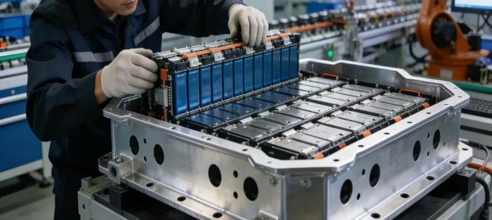 ภาคการขนส่ง: ภาพระยะใกล้ของชุดประกอบเฟรมชุดแบตเตอรี่รถยนต์พลังงานใหม่