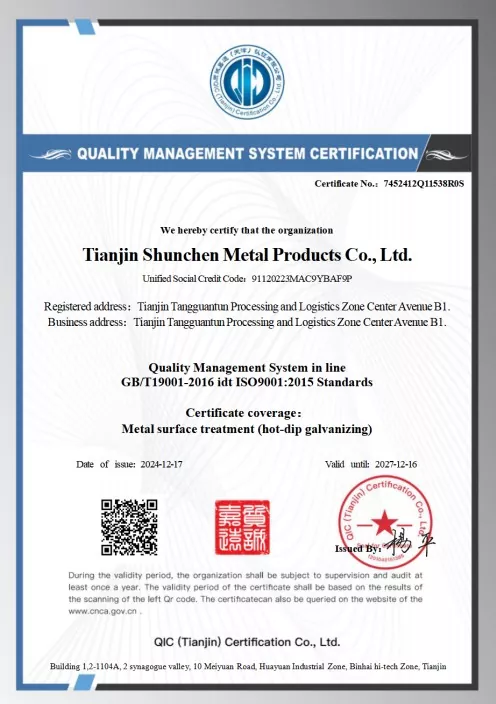 กระบวนการชุบสังกะสี: การชุบสังกะสีแบบจุ่มร้อน (ความหนาของชั้นสังกะสี ≥ 85μm), การชุบสังกะสีด้วยไฟฟ้า (ความหนาของชั้นสังกะสี ≥ 12μm) เป็นไปตามมาตรฐาน GB/T 13912-2020
