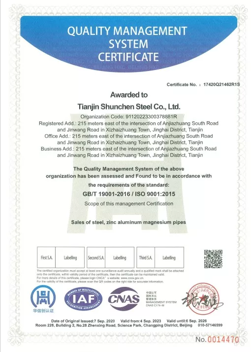 มาตรฐาน: GB/T 3091-2015 "ท่อเหล็กเชื่อมสำหรับการขนส่งของเหลวความดันต่ำ", GB/T 13912-2020 "ท่อเหล็กชุบสังกะสีแบบจุ่มร้อน" ผลิตภัณฑ์ผ่านการทดสอบโดยบุคคลที่สามและมีรายงานผลการทดสอบ