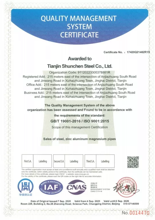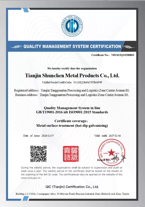 บริษัท Tianjin Shunchen Industrial Company ได้สะสมประสบการณ์การผลิตในอุตสาหกรรมเหล็กมากว่าสามทศวรรษ บริษัทได้รับการรับรองระบบ ISO 9000, 3A ตลอดจนการรับรอง CE ของสหภาพยุโรป และได้สร้างรูปแบบห่วงโซ่อุตสาหกรรมเต็มรูปแบบตั้งแต่กระบวนการชุบสังกะสีไปจนถึงการขายและการจัดจำหน่าย ด้วยขั้นตอนกระบวนการ 12 ขั้นตอนอันเข้มงวดและกลไกการตรวจสอบที่ครอบคลุมสามระดับ บริษัทประสบความสำเร็จในการบันทึกอุบัติเหตุด้านคุณภาพและความปลอดภัยประจำปีเป็นศูนย์ และการผิดนัดผิดนัดตามคำสั่งเป็นศูนย์เป็นเวลา 12 ปีติดต่อกัน Shunchen Industrial รักษาสินค้าคงคลังสปอตเหล็กชุบสังกะสีตลอดทั้งปีมากกว่า 20,000 ตัน กลายเป็นซูเปอร์มาร์เก็ตเหล็กชุบสังกะสีขนาดใหญ่ที่ผสมผสานคลังสินค้าและการจัดจำหน่ายเข้าด้วยกัน คลังสินค้าครอบคลุมพื้นที่ 10,000 ตารางเมตร ซึ่งให้การสนับสนุนที่มั่นคงสำหรับการผลิตและการบริการการขายแบบครบวงจร